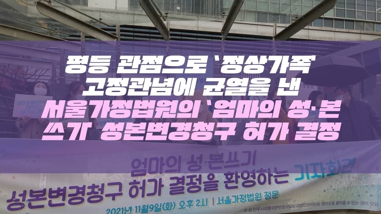 현행 법제 하에서 엄마의 성을 자녀에게 물려주려면 혼인신고 시 협의를 하고 이를 증명하는 별도의 협의서를 작성하거나, 민법 제781조 제6항에 따라 ‘자의 복리를 위하여 자의 성과 본을 변경할 필요가 있을 때’ 성본변경청구를 하여야 한다. 그러나 성본변경청구는 주로 재혼가정 등 자녀의 복리를 위한다는 사실이 쉽게 증명되는 경우에 활용되어 자녀에게 엄마의 성을 물려주기로 결정한 부부들이 원치 않게 이혼을 하고 재혼인신고를 해야하는 부담이 있었고, 협의서 역시 자녀에 대한 계획을 세우지 않았을 수 있는 혼인신고 시에 미리 해야된다는 점에서 현실적이지 않았다. 2021년 11월 9일 서울가정법원의 성본변경청구 허가는 재혼 가정이 아닌 일반 가정에서도 엄마의 성본을 자녀에게 물려줌으로써 자녀가 입는 불이익보다 이익이 더 크며 궁극적으로 자녀의 복리에 부합할 수 있다는 점을 인정한 뜻 깊은 결정이었다. 서울가정법원의 결정은 부성우선주의에 대한 헌법불합치 결정에도 불구하고 여전히 많은 법제도와 관례들이 다양한 가족의 형태를 담지 못하는 가운데, 평등의 관점으로 자녀의 복리를 이해하고 '정상가족'이라는 허울뿐인 고정관념에 균열을 내 성평등 사회를 위한 한 걸음을 내딛게 했다.