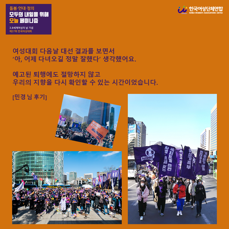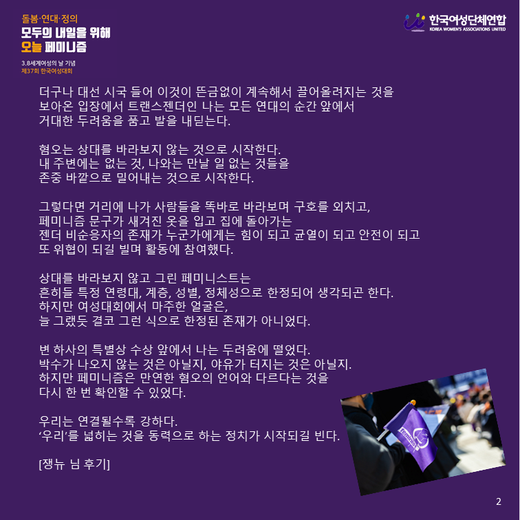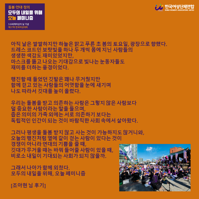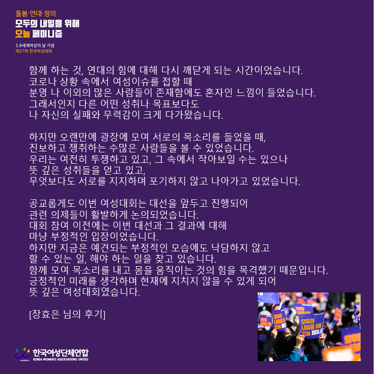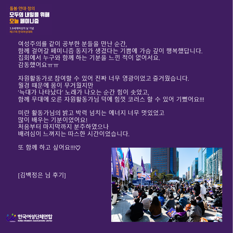 2022 3.8 세계여성의 날 기념 제37회 한국여성대회에 함께 해주신 자원활동가들의 후기를 소개합니다.