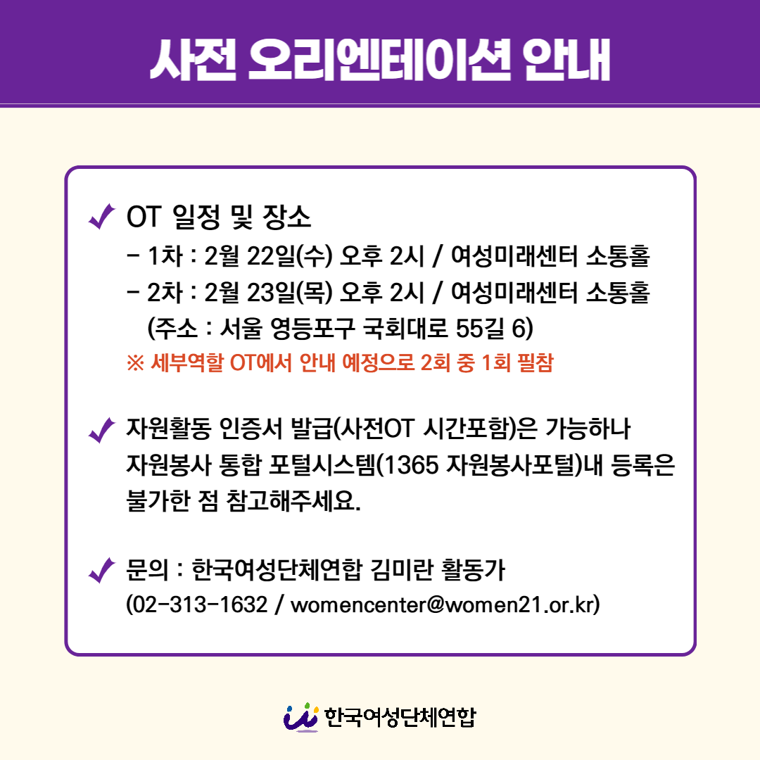 - 2차 : 2월 23일(목) 오후 2시, 여성미래센터 소통홀(영등포구 국회대로 55길 6 B1)