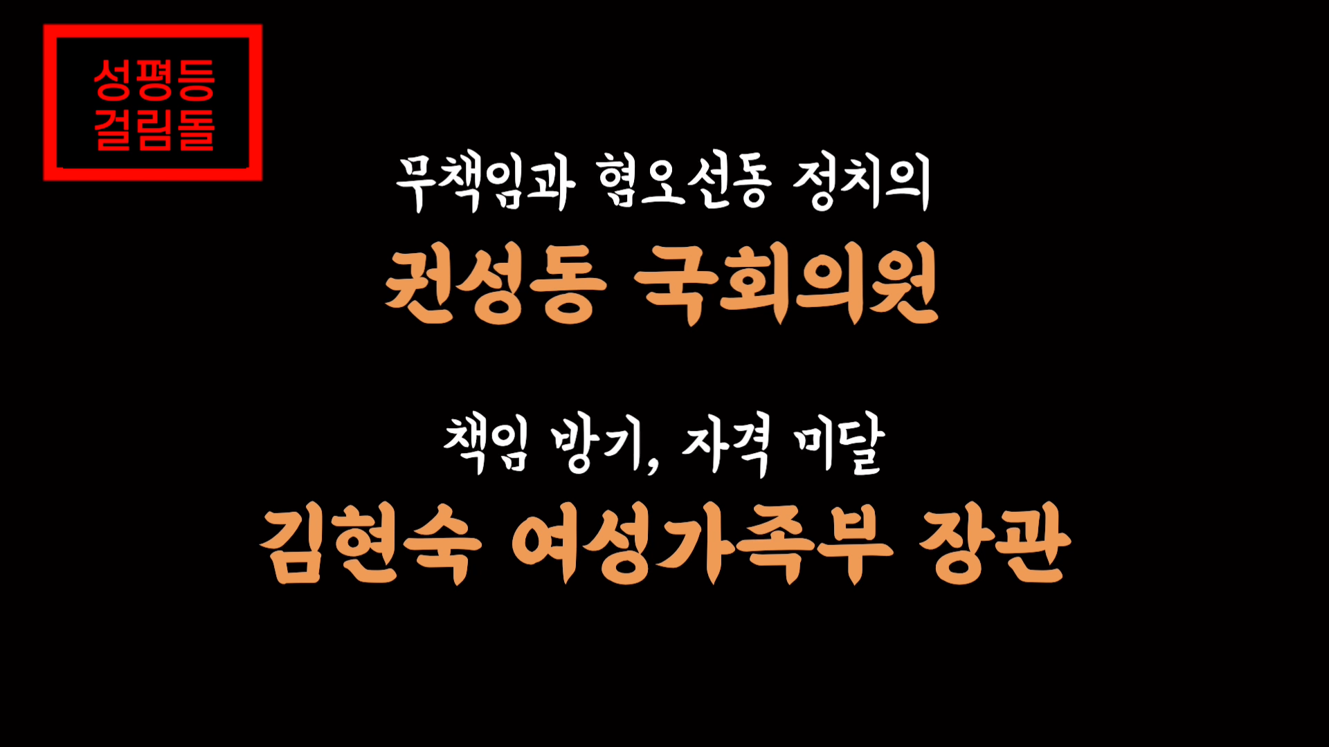 이처럼 권성동 국회의원은 자신에게 부여된 권력을 혐오와 선동의 정치를 바로잡기보다는 오히려 편승하여 권력을 유지하는 것에 또다시 활용하며 우리 사회 성평등 실현을 가로막고 있다. 성평등 정책 전담부처의 장관으로서 법에 부여된 책무를 수행해야 하는 김현숙 여성가족부 장관은 성평등 가치를 확산하고 성차별 해소를 위해 힘써야 함에도 자신의 책임과 역할을 방기하였다.