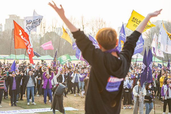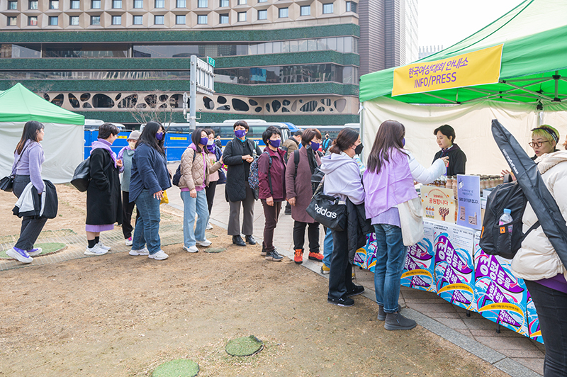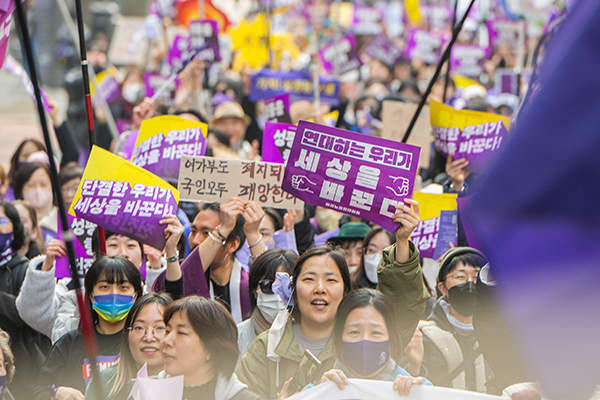 지난 3월 4일(토) 서울광장에서는 3.8세계여성의 날 기념 제38회 한국여성대회가 수많은 시민들이 참여한 가운데 개최되었습니다. 드레스코드였던 보라색 옷과 깃발, 각종 소품으로 치장한 여성·시민들로 서울광장은 보랏빛으로 넘실거렸습니다. 여성대회에 참여한 1만 5천여명의 시민들은 성평등 가치를 지향하는 서로의 존재와 연대를 확인하고, 성평등 사회를 향한 전진을 다짐했습니다.