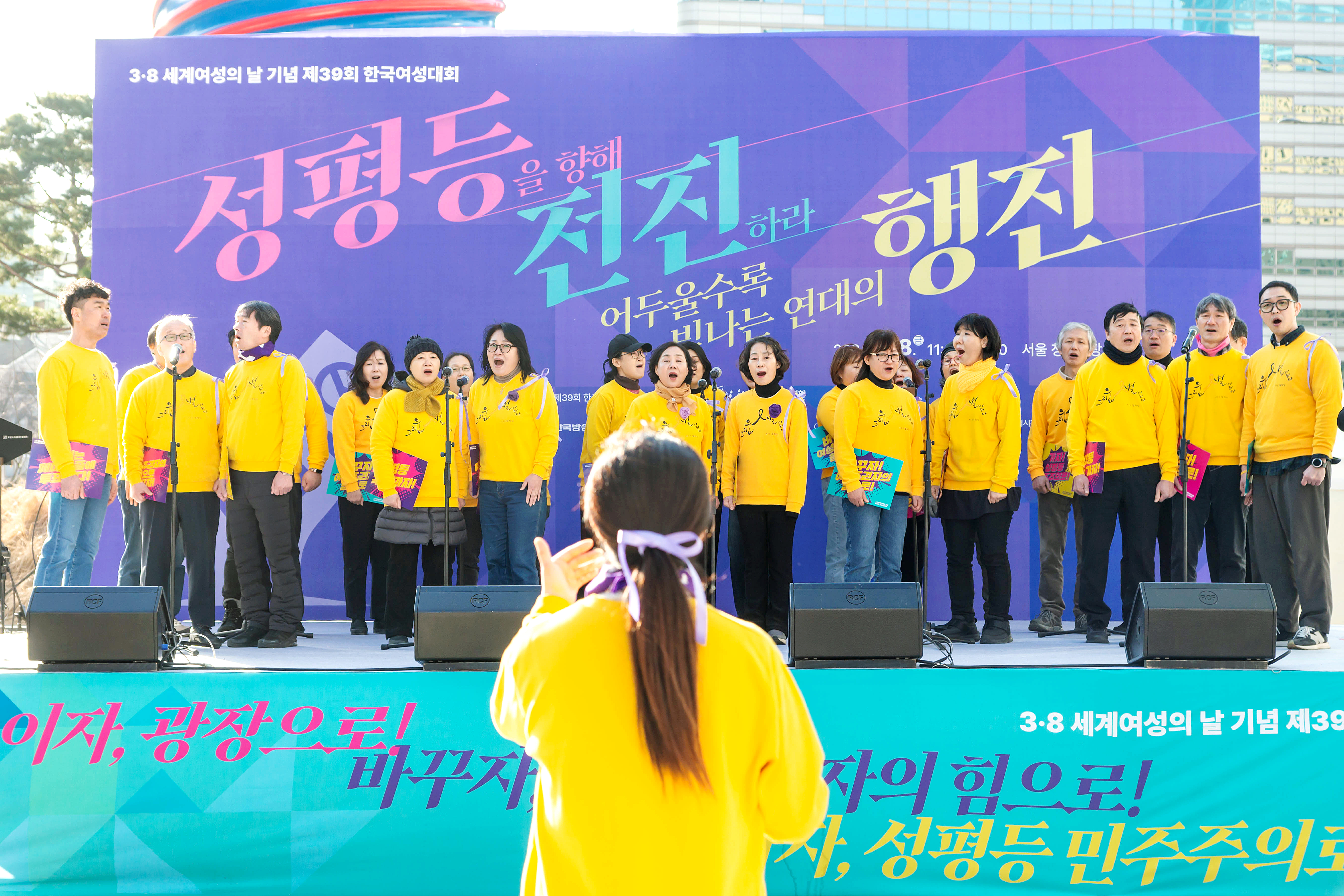 지난 3월 8일(금) 서울 청계광장에서는 <3.8 세계여성의 날 기념 제39회 한국여성대회>가 수많은 시민들이 참여한 가운데 개최되었습니다. '성평등을 향해 전진하라- 어두울수록 빛나는 연대의 행진' 슬로건으로 개최된 이번 대회에는 전국에서 모인 2천 여명 여성·시민들이 성평등 사회로의 전진을 다짐했습니다.