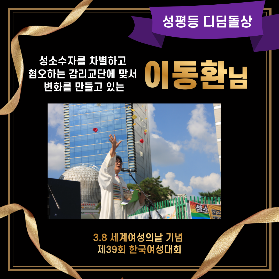 2019년 8월 31일 기독교대한감리교단 소속 이동환 목사는 인천 퀴어문화축제에서 성소수자에게 꽃잎을 뿌리며 축복식을 집례하였다. 이에 감리교단에서는 ‘동성애를 찬성하거나 동조하는 행위를 했을 때 정직·면직·출교 등의 처벌을 할 수 있다’는 교리와장정(기독교대한감리회 법) 제3조 8항을 근거로 이동환 목사를 교단 재판위원회에 기소했다. 2년 만에 나온 판결은 ‘정직 2년’. 이동환 목사는 굴복하지 않고, 징계무효확인소송을 제기했다.
