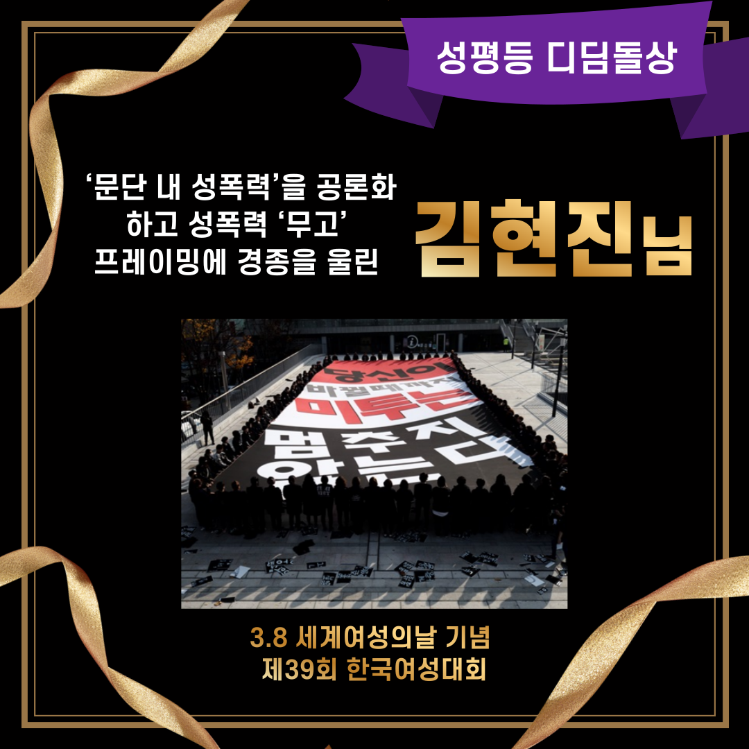 김현진 씨는 가해자가 ‘꼼수’ 소송전략으로 활용한 형상공탁제도의 한계를 널리 알렸고, 미투운동(#Metoo)을 왜곡하는 성폭력 피해 고발에 대한 ‘무고’ 프레이밍에 굴복하지 않고 끝까지 싸우며 수많은 여성에게 큰 용기를 주었다.