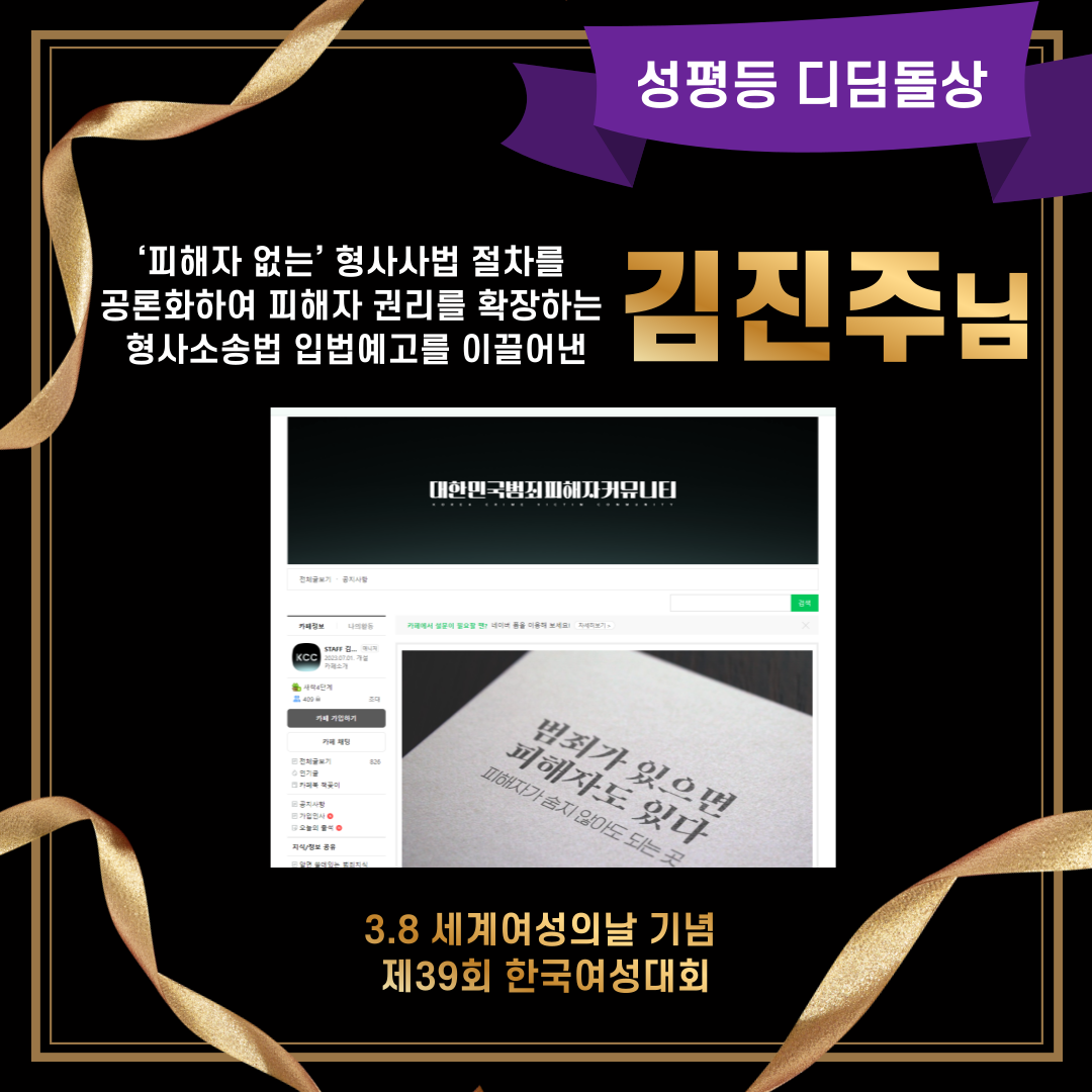 ‘피해자 없는’ 형사사법 절차를 공론화하여 피해자 권리를 확장하는 형사소송법 입법예고를 이끌어 낸 김진주님