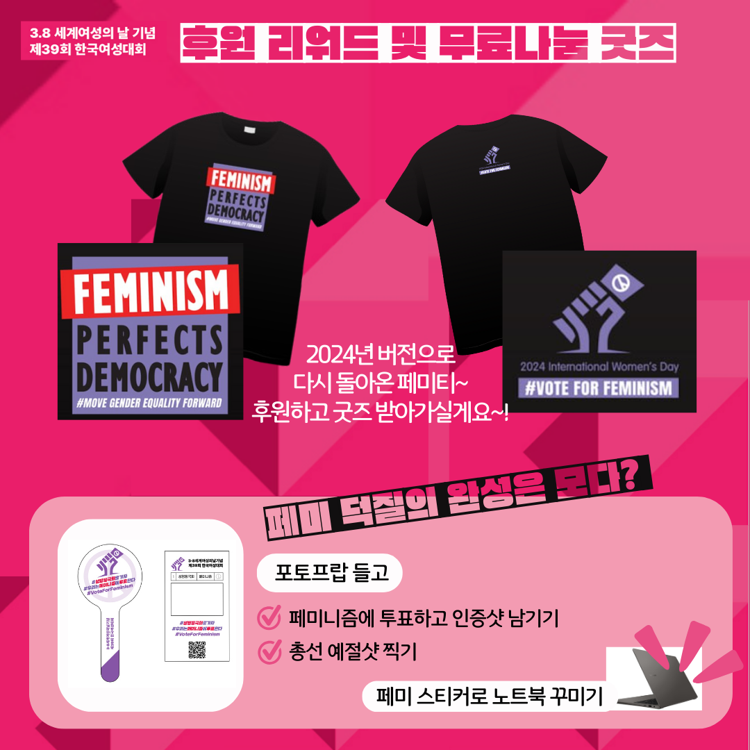 | 3.8 세계여성의 날 기념 제38회 한국여성대회 후원 굿즈 안내 (0) | 2024.03.28 |