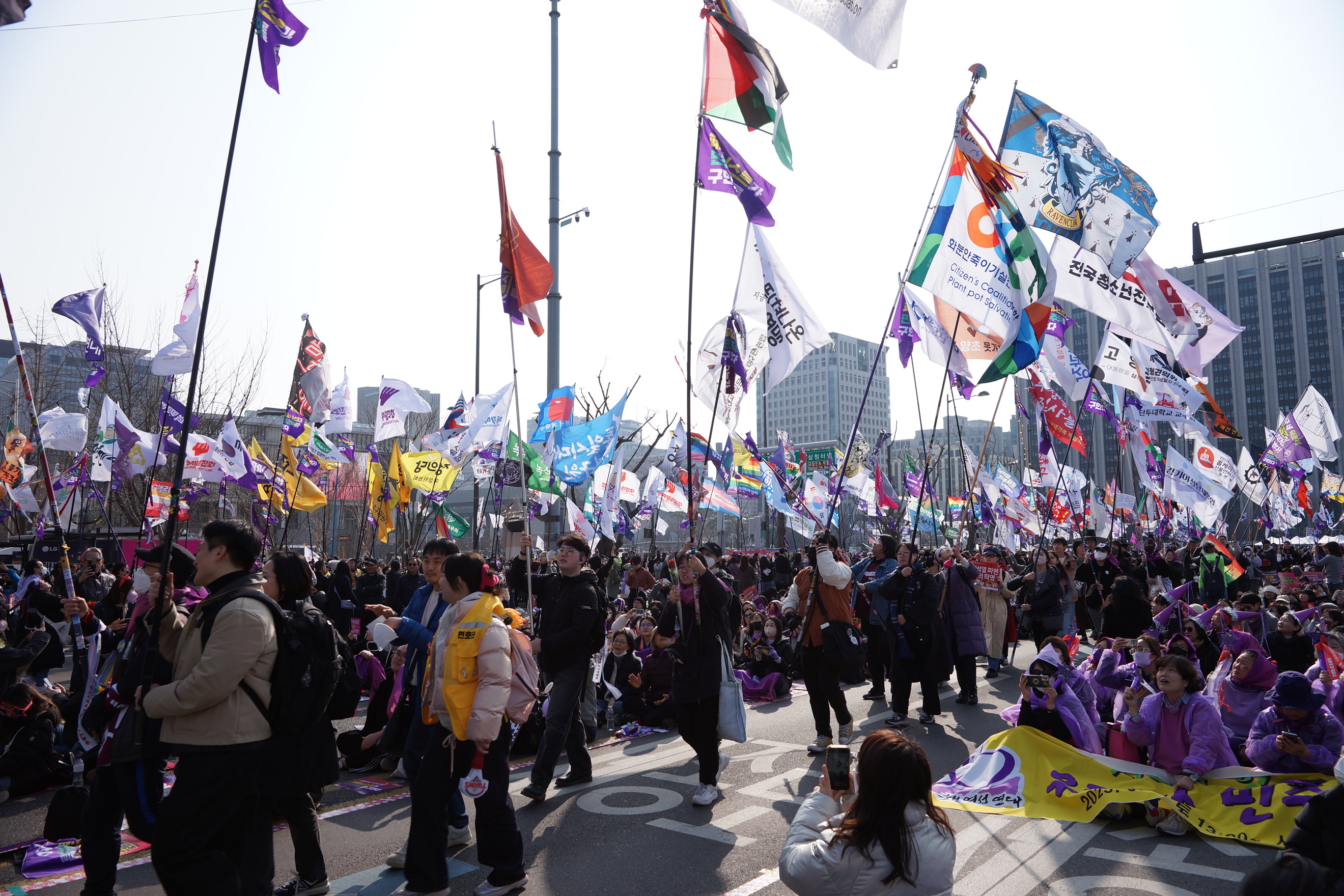 ○ 2025년 3.8 세계여성의 날 기념 제40회 한국여성대회 3월 8일(토) 오전 11시 30분 ~ 오후 5시, 광화문 동십자각에서 개최 - 3월 8일(토) 오전 11시 30분부터 광화문 동십자각에서 3.8세계여성의 날 기념 제40회 한국여성대회가 개최되었습니다. ‘시대를 잇는 우리의 연대-페미니스트가 민주주의를 구한다’ 슬로건으로 개최된 이번 대회에는 전국에서 모인 1만 5천 여명(연인원) 여성‧시민들이 윤석열 파면을 외치며, 모든 차별과 폭력, 부정의에 적극적으로 대항하며 한국사회 민주주의를 만들어 온 다양한 시대의 여성들이 서로의 존재를 확인하고, 더 다양한 존재들과의 단단한 연대를 이어가기로 다짐했습니다. - 오전 11시 30분부터 시작된 시민난장은 여성, 시민사회, 환경, 종교, 정당 등 다양한 영역의 참여자들이 각양각색의 캠페인과 참여프로그램을 진행했습니다. 오프닝 무대인 ‘브라질리언 퍼커션 앙상블팀 호레이’의 공연으로 본격적인 기념식을 시작했습니다. - 또한 지난 한 해 우리 사회의 성평등 정책을 후퇴시켜 온 ‘성평등 걸림돌’을 발표하였습니다. 뿐만 아니라 지난 한 해 우리 사회의 성평등과 여성운동 발전에 공헌한 ‘성평등 디딤돌’과 ‘올해의 여성운동상’ 이 발표되었습니다. 수상자들의 말하기와 여성대회 참여자들의 축하와 응원, 연대의 메세지가 이어졌습니다. - 올해 3·8 세계여성의 날 기념 한국여성대회는 40주년을 맞아 시대를 잇는 여성들의 연대 발언과 시민들이 직접 참여하여 만든 ‘함께 만드는 <3·8 여성선언문>’이 발표되었습니다. 이어 이소선 합창단의 공연과 함께 수많은 깃발과 함께하는 깃발 퍼포먼스가 진행되었습니다. 마지막으로 참여자 모두가 흥겹게 춤을 추면서 현재의 정치적 위기를 타개하고 새로운 사회 대안으로써의 페미니즘 가치를 재확인하며, 성평등 민주주의 실현을 향한 수많은 시민들의 열망을 모아내었습니다. |