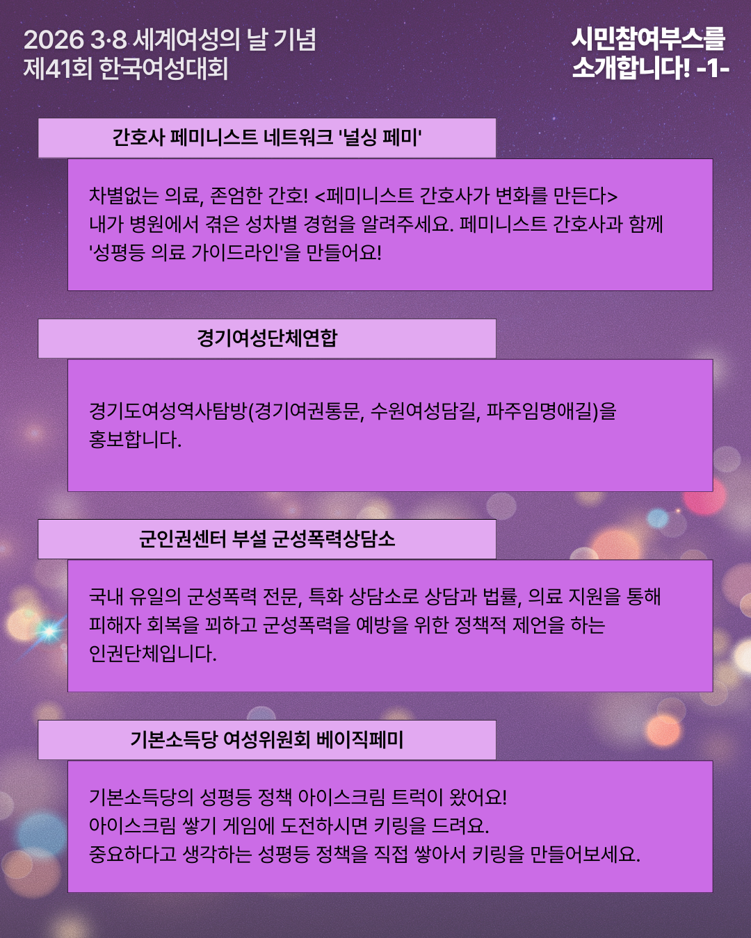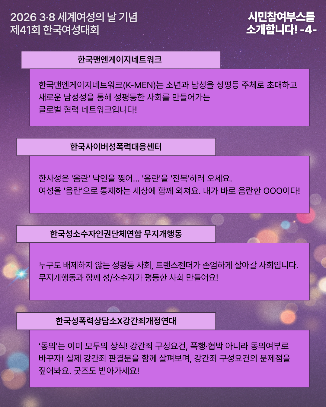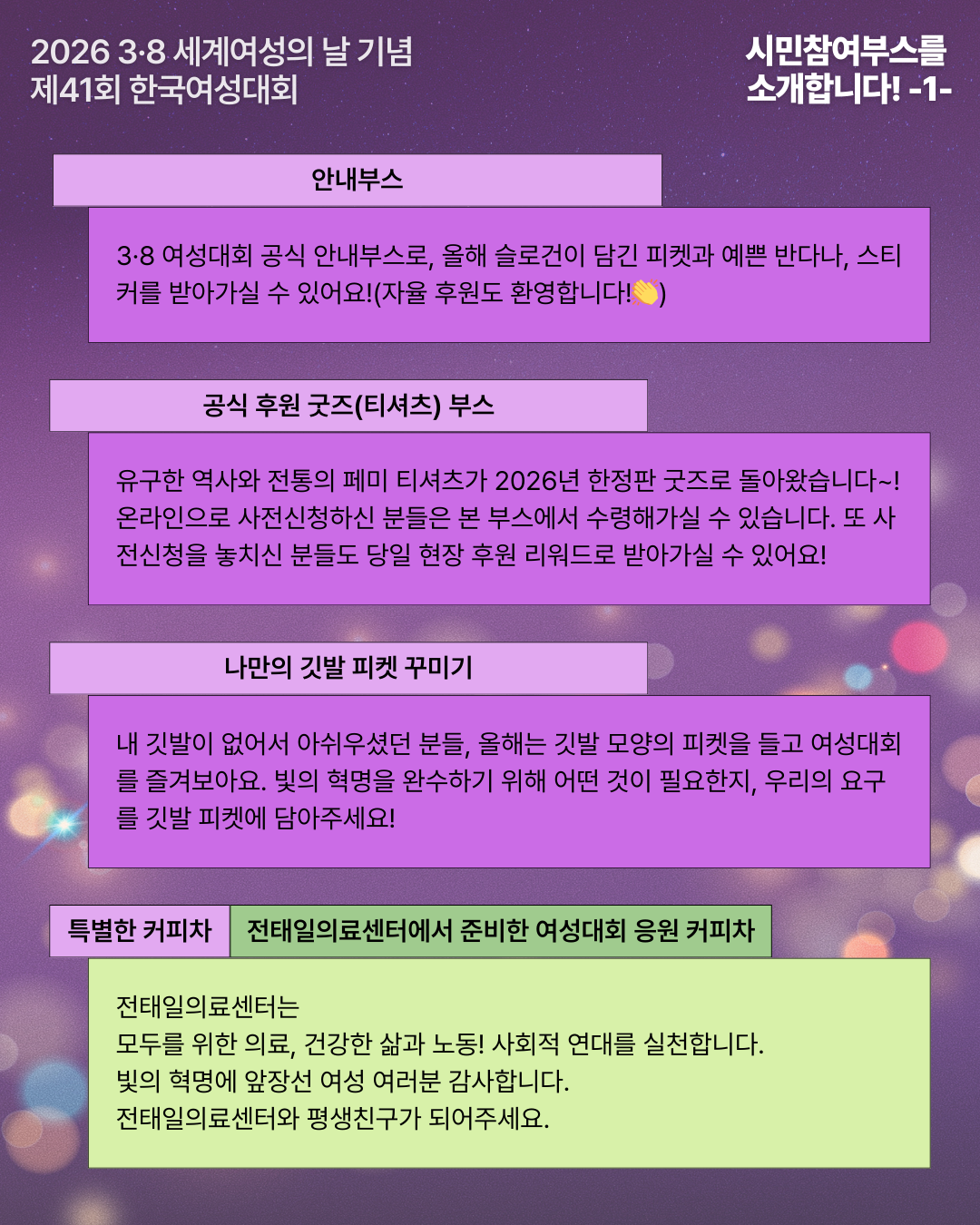| 2026 3·8 세계여성의날 기념 제41회 한국여성대회 : 빛의 혁명을 완수하라! 성평등이 민주주의의 완성이다 - 모이자 광장으로, 여성주권자의 힘으로! (0) | 2026.02.05 |