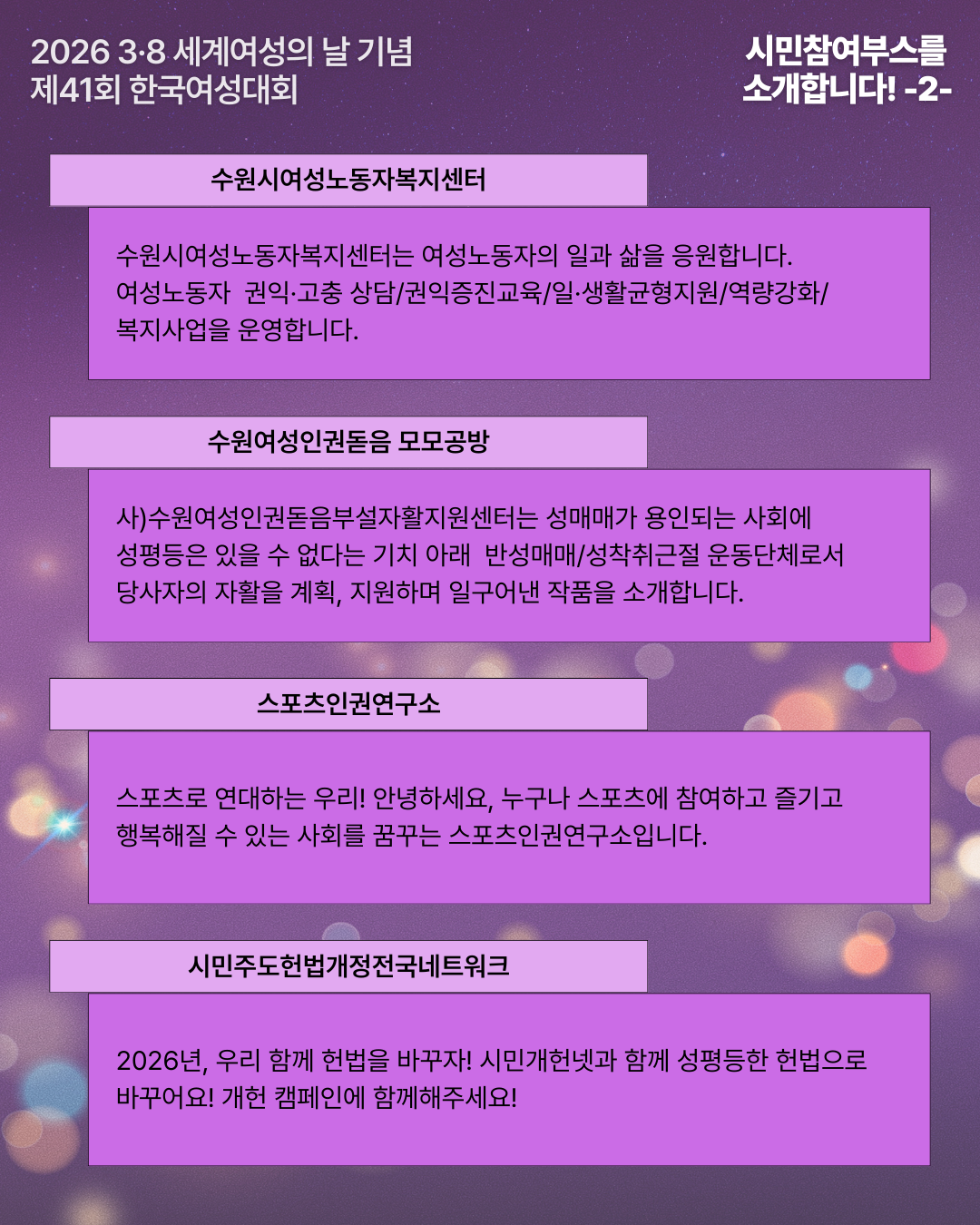 | [자원활동가 모집] 2026년 3·8세계여성의날 기념 제41회 한국여성대회자원활동가를 모집합니다!(~2/5) (0) | 2026.01.26 |