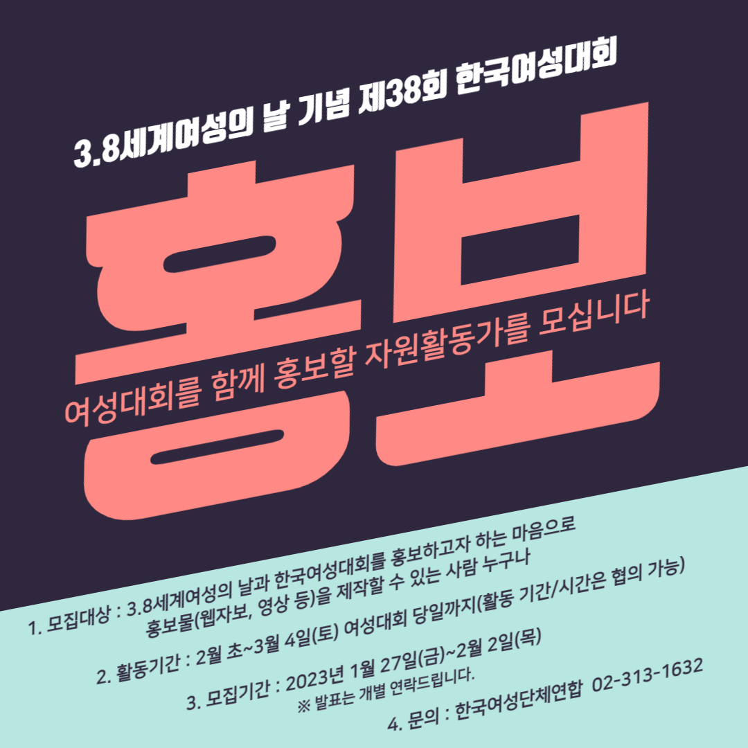 2023년 3.8세계여성의날 기념 제38회 한국여성대회 홍보 자원활동가 모집