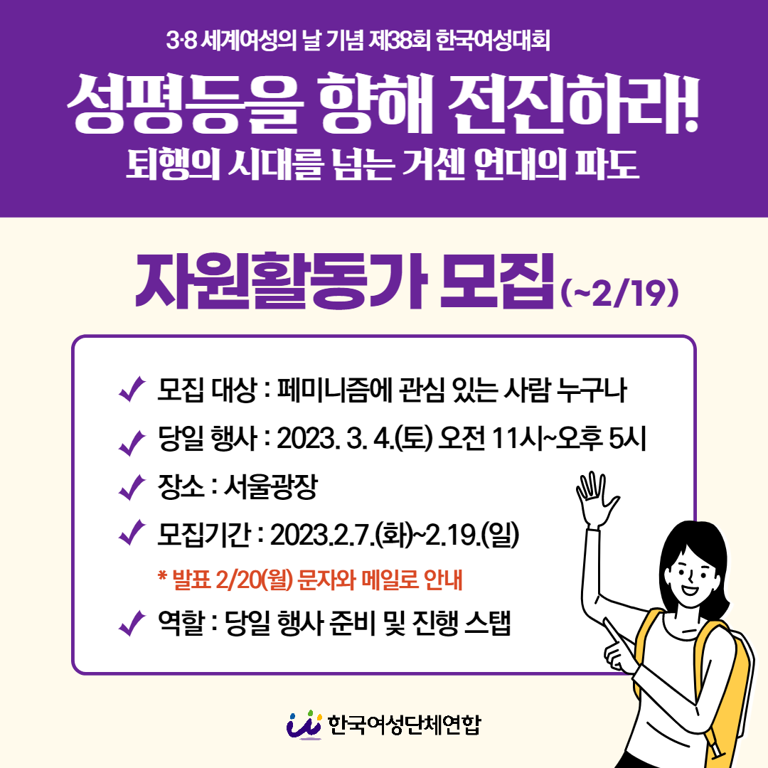 2023년 3.8세계여성의 날 기념 제38회 한국여성대회 자원활동가 모집 (~2/19)