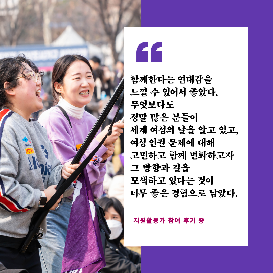 "일상 속에서 쉽게 느낄 수 없었던, 함께한다는 연대감을 느낄 수 있어서 좋았다. 무엇보다도 정말 많은 분들이 세계 여성의 날을 알고 있고, 여성 인권 문제에 대해 고민하고 함께 변화하고자 그 방향과 길을 모색하고 있다는 것이 너무 좋은 경험으로 남았다."
