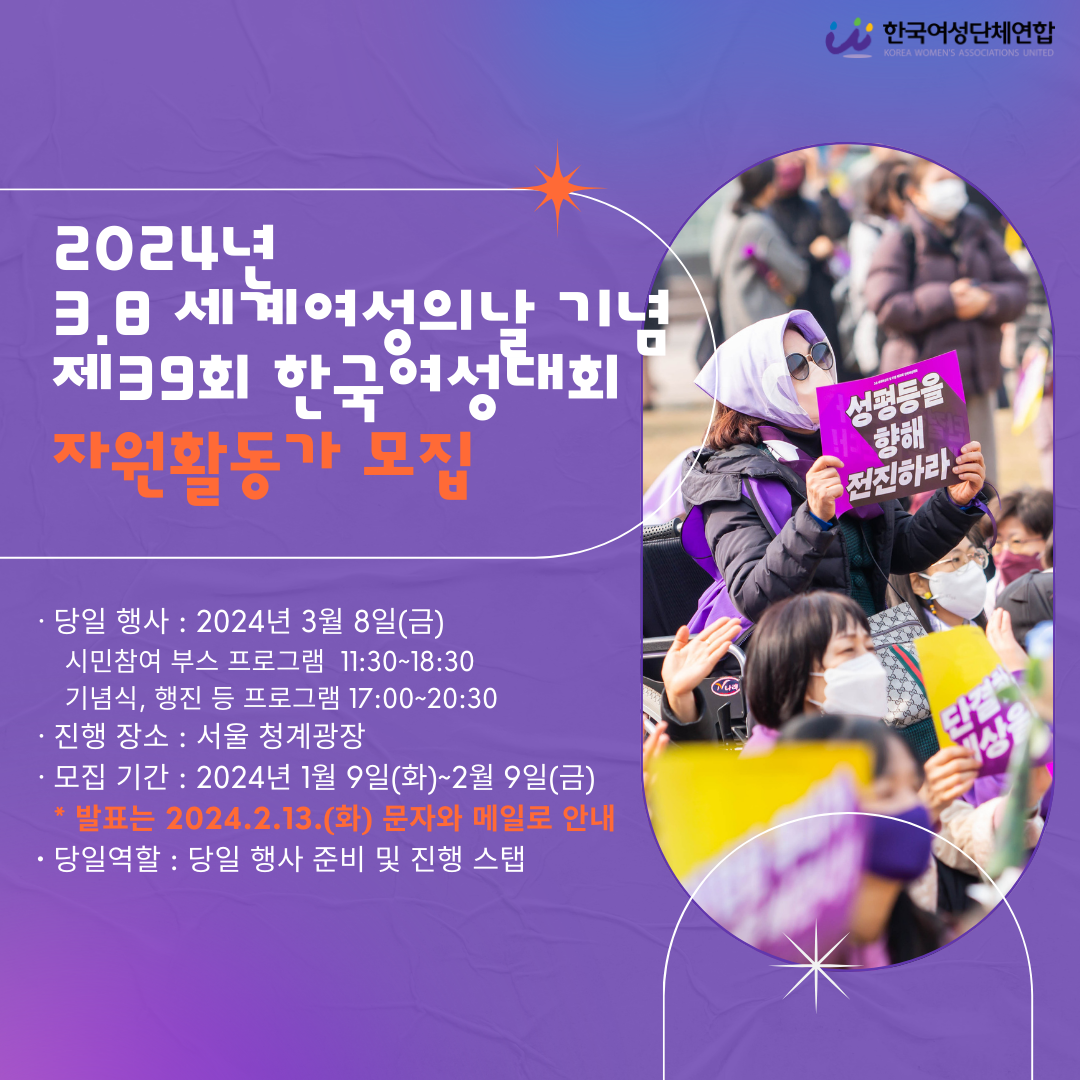 [여성대회] 2024년 제39회 한국여성대회 자원활동가를 모집합니다! (~2/9(금))
