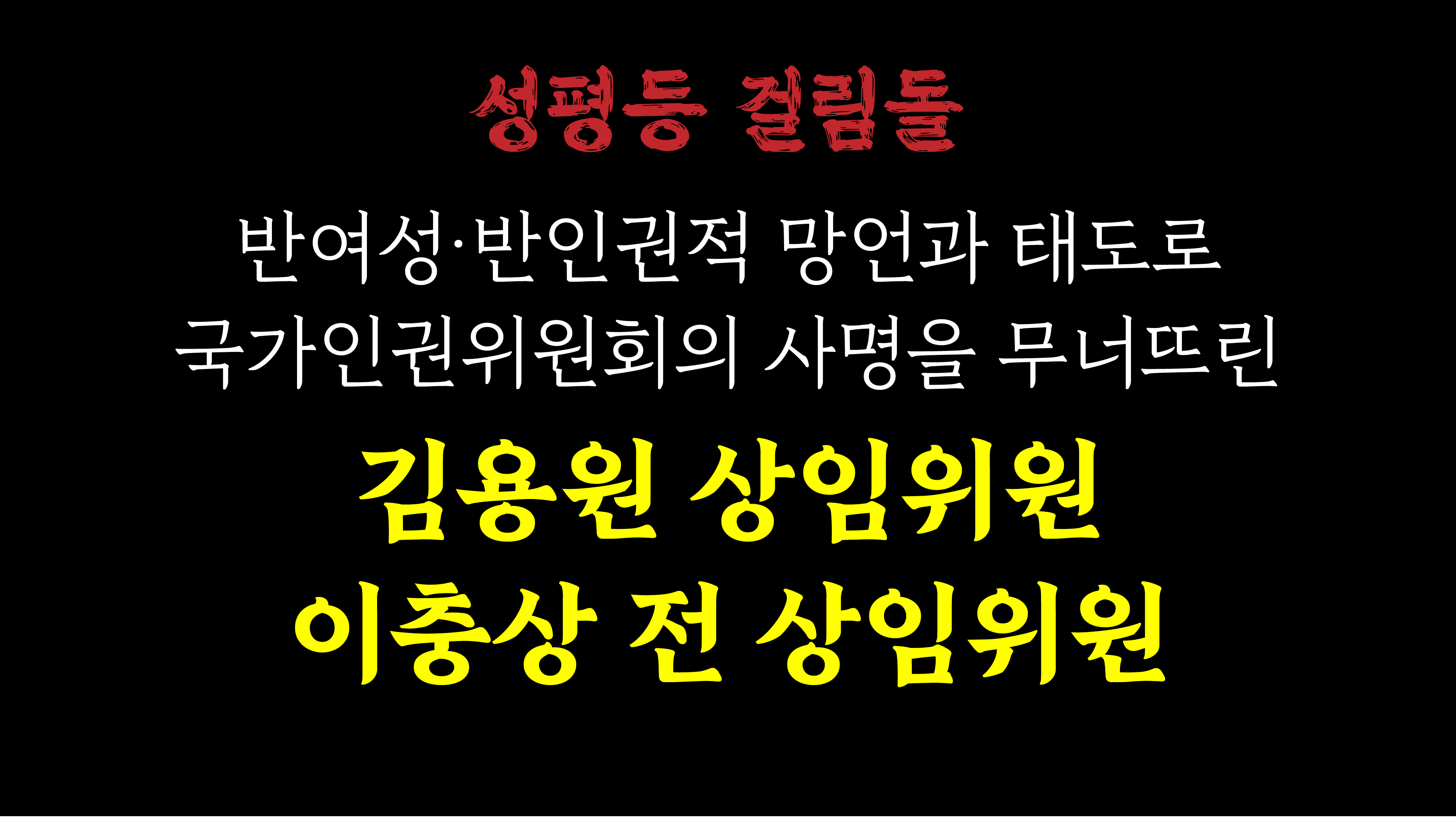 김용원 상임위원, 이충상 전 상임위원은 여성을 포함하여 모든 사람이 차별받지 않고 존엄을 보장받는 사회를 만드는 책임이 있는 국가인권위원회(이하 ‘인권위’) 상임위원으로서의 책무를 망각하고 공식석상에서 반인권·반여성적 언행을 일삼으며 차별과 배제, 혐오의 논리를 재생산·강화하는 데 앞장서왔다.